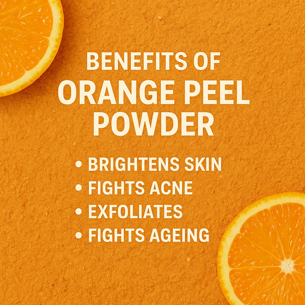1. Orange Peel Powder - The gritty texture of orange peel powder helps to slough off dead skin cells, revealing smoother, brighter skin underneath. Rich in vitamin C and antioxidants, it reduces the appearance of dark spots and blemishes. It has naturally astringent properties that can help to control excess oil production. It has anti-aging properties that can help to neutralise free radicals and tighten the skin along with a youthful appearance.
